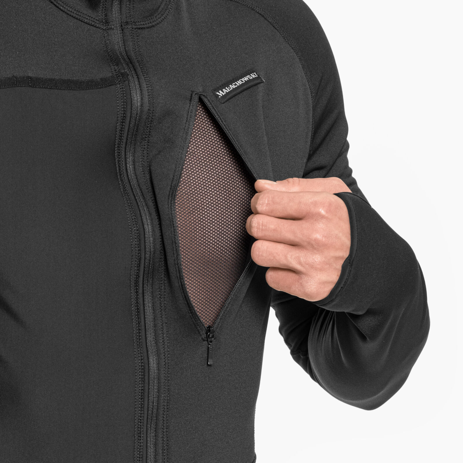 Chest-height pocket with a zipper closure;